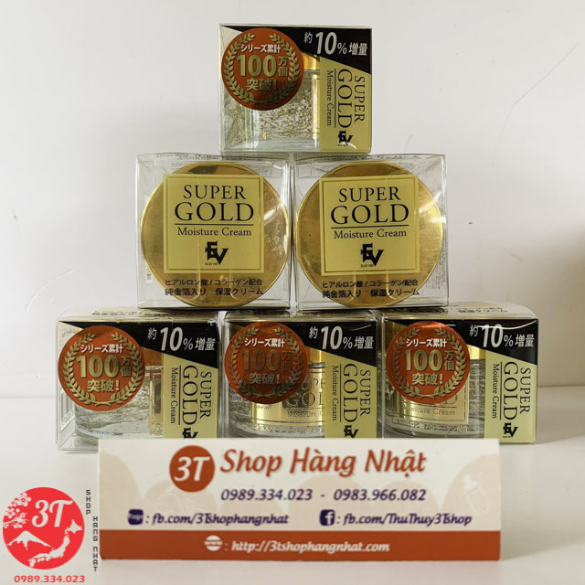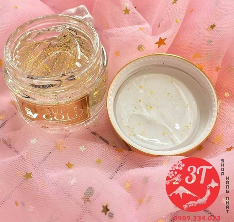 Kem dưỡng ẩm cao cấp Super Gold Nhật Bản chứa vàng lá nguyên chất, hyaluronic acid, collagen và các thảo dược quý, giúp kích thích nhanh quy trình tái tạo tế bào, chống lão hóa, xóa mờ nếp nhăn, làm mờ nám + tàn nhang hiệu quả, làm trẻ hóa làn da,tăng cường và duy trì độ ẩm cho da.