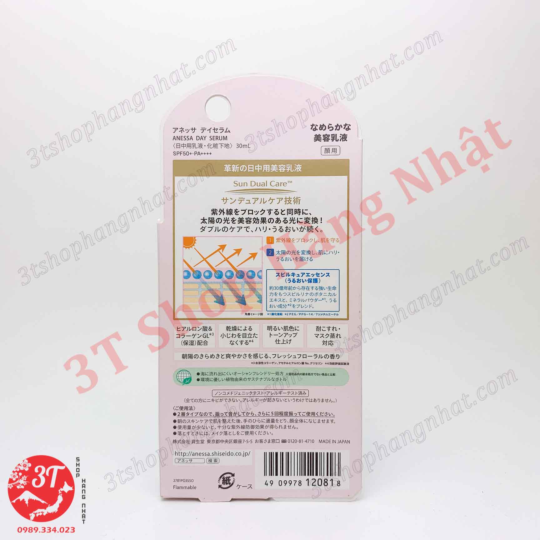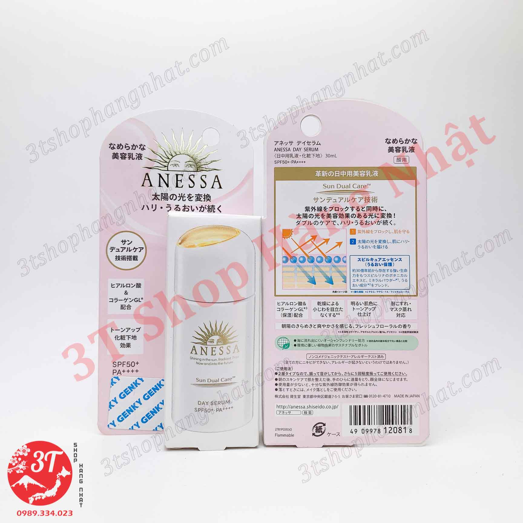 Serum Kem ngày chống nắng Anessa Day serum sử dụng công nghệ chống nắng SUN DUAL CARE đầu tiên trên thế giới, giúp bảo vệ làn da của bạn khỏi các tác nhân gây hại của tia UV và bụi mịn với SPF50+ PA++++. Phức hợp Spirulina Energy Essence trong serum có khả năng biến đổi tia UV thành Ánh Sáng Sinh Học, giúp nuôi dưỡng và phục hồi da từ sâu bên trong đồng thời ngăn ngừa các dấu hiệu lão hoá như nếp nhăn và đốm nâu.